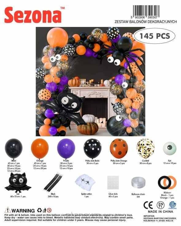 Efektowny zestaw balonów w halloweenowej kolorystyce czerni, pomarańczu i fioletu z dodatkiem balonów z konfetti oraz motywów pająków i oczu. Idealny do stworzenia imponującej girlandy balonowej na Halloween, imprezy tematyczne, eventy oraz dekoracje wnętrz i witryn. W komplecie balony w różnych rozmiarach oraz akcesoria do montażu.