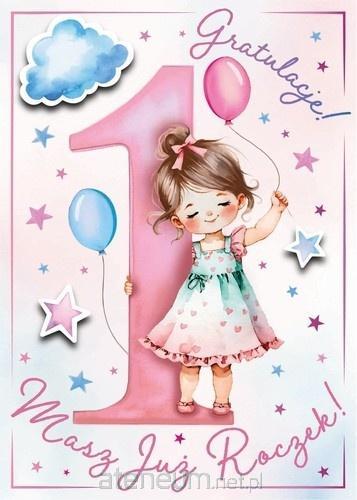 Karnet B6 brokat z kopertą Urodziny 1 dziewczynka
