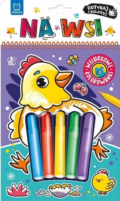Dotykaj i koloruj. Na wsi to kolorowanka sensoryczna z dołączonymi pisakami. Tło obrazków pokrywa czarny welur, który podkreśla głębię kolorów, zapewnia wrażenia sensoryczne i ogranicza wychodzenie poza linię. Małych fanów i fanki zwierząt czeka spotkanie z mieszkańcami wiejskiej zagrody. W tym gronie znajdą się lubiane przez dzieci: owieczka i motylek, świnka, kogut, konik, kura z kurczętami, baran i wróble, kaczka z kaczętami, krowa i ślimak. Dzieci nie tylko pokolorują 8 uroczych rysunków. Przeczytają również wierszyki o zwierzętach z ilustracji. A dzięki perforacji pokolorowaną pracę mogą oderwać, włożyć do ramki i podarować w prezencie lub ozdobić nią pokój.
