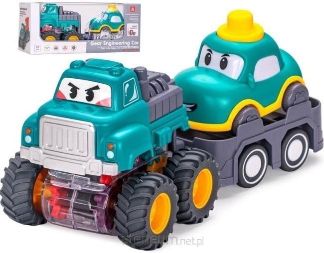 Ciężarówka została wyposażona w duże, gumowane opony z wyraźnym bieżnikiem, co pozwala na stabilną jazdę i pokonywanie drobnych przeszkód. Do zestawu dołączona jest odczepiana laweta, na której podróżuje mniejszy, uśmiechnięty samochodzik z charakterystycznym żółtym elementem na dachu. Oba pojazdy posiadają przyjazne buzie, co nadaje im osobowości i zachęca do kreatywnego odgrywania scenek. Całość została wykonana z bezpiecznych i odpornych na uderzenia materiałów, co gwarantuje trwałość zabawki nawet podczas intensywnego użytkowania. To zestaw, który łączy naukę z radością, rozwijając zdolności manualne oraz koordynację ruchową malucha.
