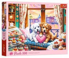 Puzzle 500 elementów Zakochane mruczki przedstawiające koty wpatrujące się w niebo, wśród kolorowych kwiatów. Po ułożeniu powstanie obrazek o wymiarach 48x34 cm. Wysoką jakość, nasycenie kolorów i bezpieczeństwo układania zapewnia kalandrowany papier odbijający światło, pokryty ekologicznymi farbami spożywczymi.