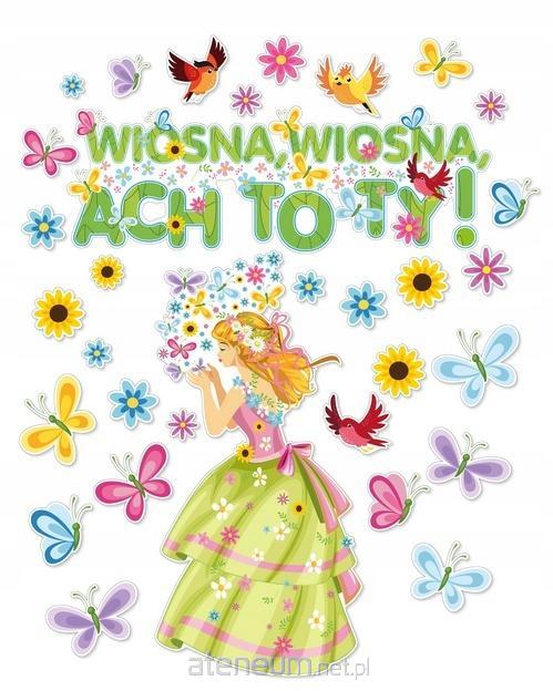Duży zestaw dekoracji składa się z: Dużej Pani Wiosny dmuchającej motylkami, Dużego napisu "Wiosna, Wiosna, Ach to Ty!, 3 kolorowych ptaszków, 12 kolorowych motylków oraz 13 kolorowych kwiatków.