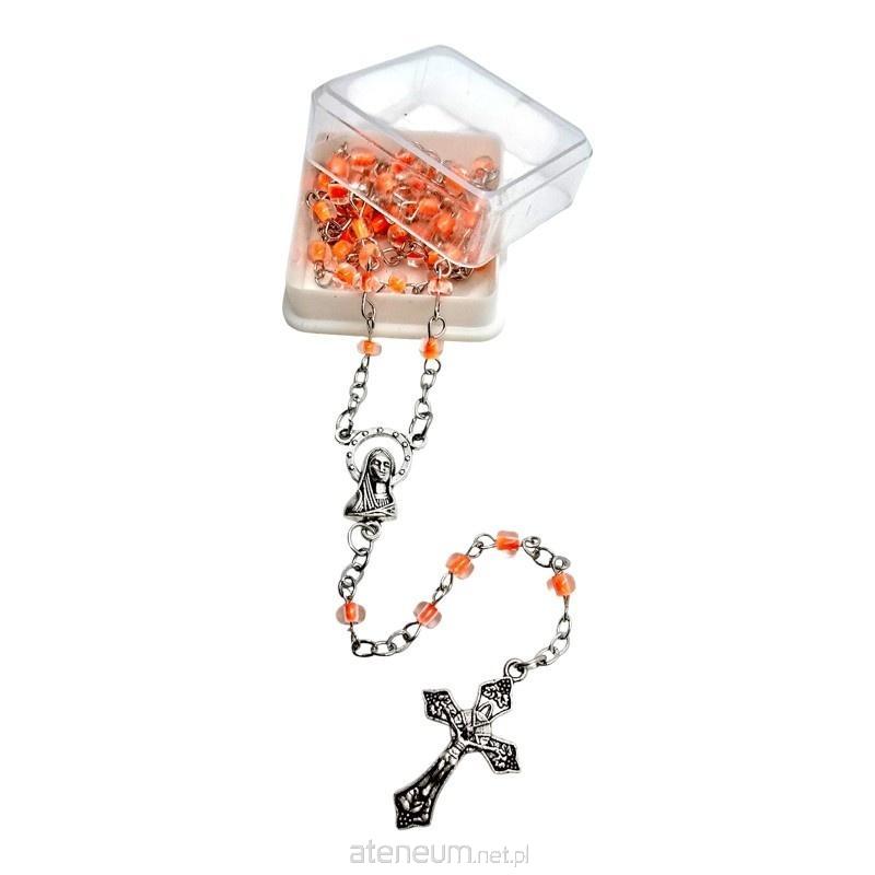 Koraliki różańca wykonane są z przeźroczystego plastiku, w którego środek ma jasny, pomarańczowy kolor. Takie połączenie nadaje im wyjątkowej elegancji i atrakcyjnego efektu wizualnego, przypominającego bursztyn lub ciepły zachód słońca. Koraliki mają około 4 mm wielkości.