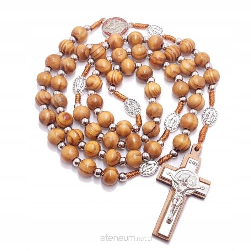 Ten niestandardowy, pięknie wykonany drewniany różaniec to wyjątkowy przedmiot dla osób poszukujących różańca o szczególnym znaczeniu. Poszczególne dziesiątki rozdzielone są medalikami: największy z krzyżem i wizerunkiem św. Benedykta, a kolejne z Niepokalanym Poczęciem Najświętszej Maryi Panny. Każdy drewniany koralik oddzielony jest małą, srebrną kuleczką.