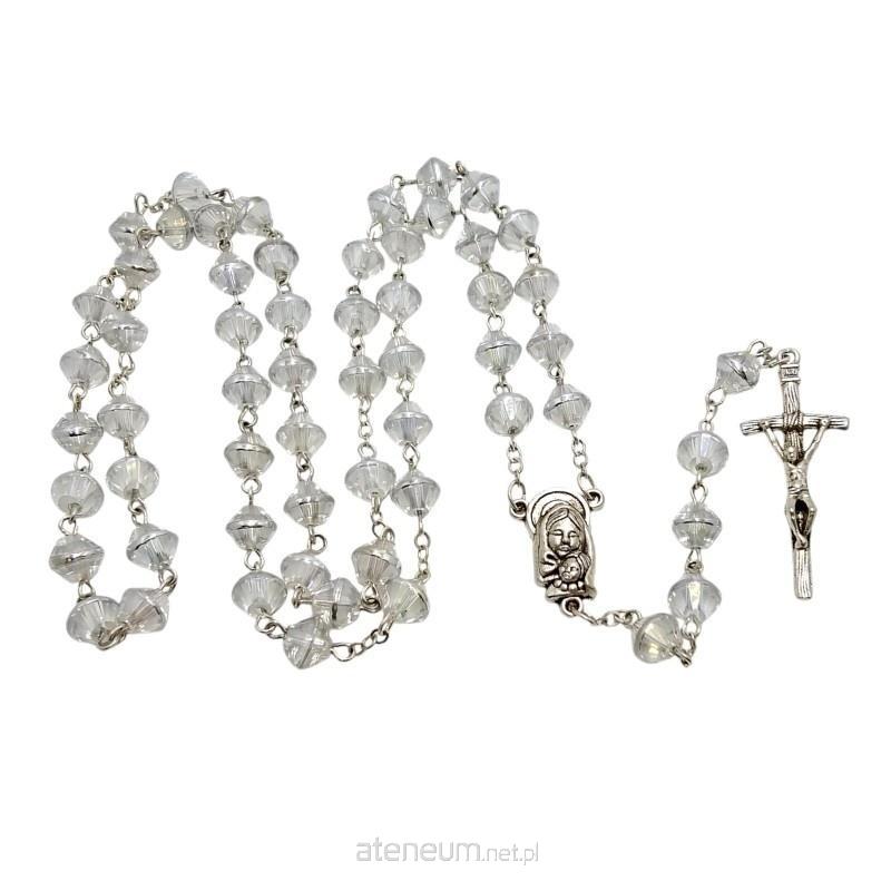 Elegancki Różaniec ze Szlifowanego Szkła Przeźroczysty z Poświatą i Papieskim Krzyżem - Matka Boża z Dzieciątkiem