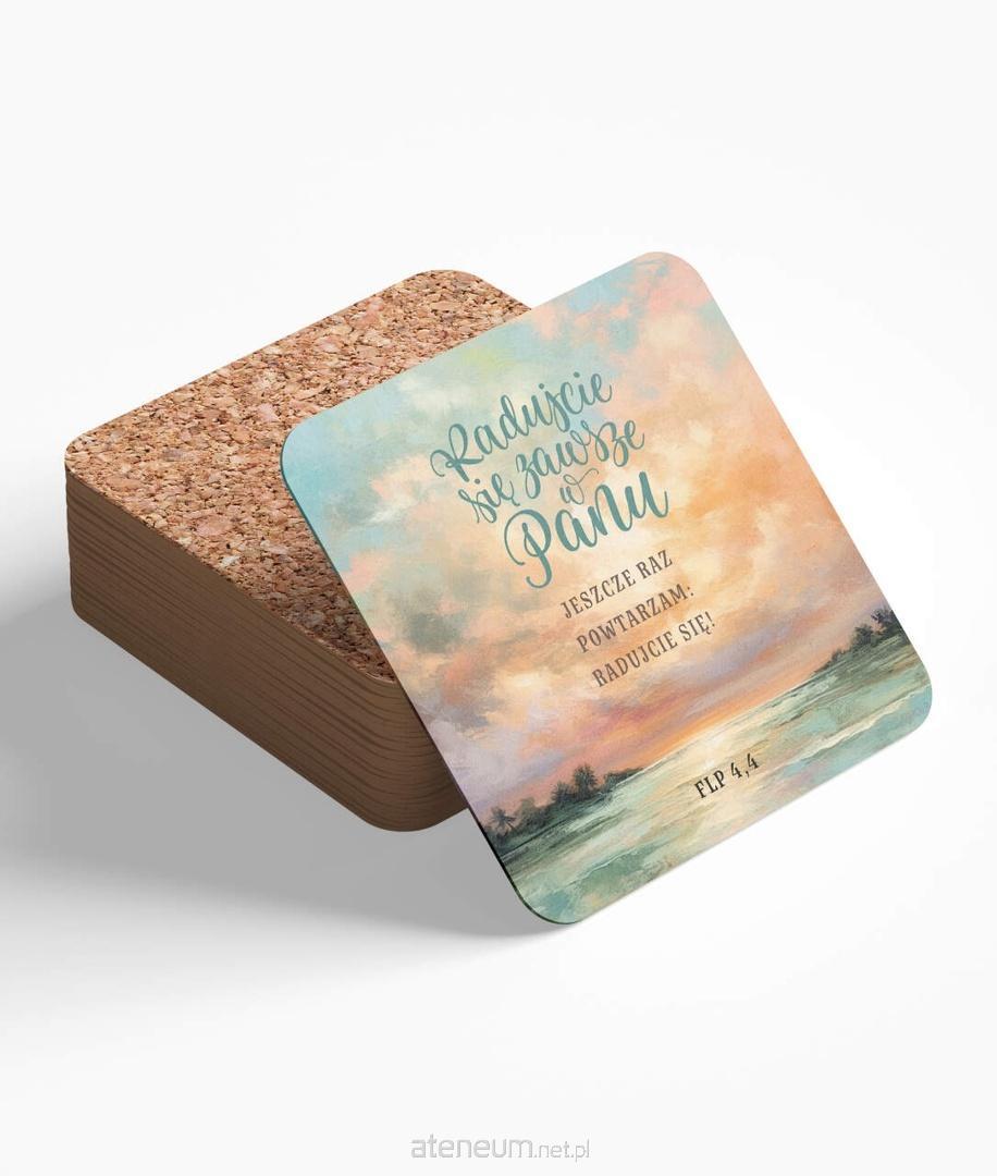 Podkładka zawiera radosny cytat z Listu do Filipian 4,4: \"Radujcie się zawsze w Panu, powtarzam radujcie się\". Ten pełen radości fragment przypomina o radości płynącej z wiary i zaufania do Boga. Całość wzbogaca malowana grafika przedstawiająca naturę o zachodzie słońca, która tworzy spokojny i harmonijny klimat, doskonale współgrający z przesłaniem cytatu.