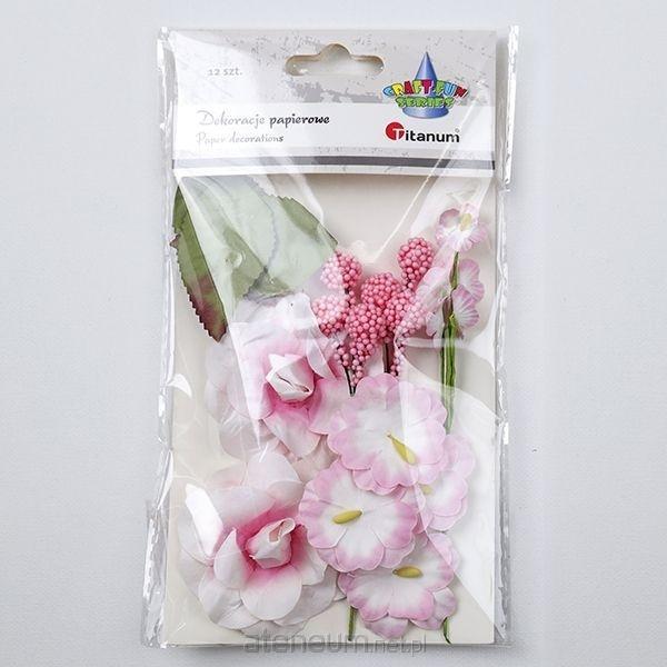Dekoracje papierowe kwiaty róży O60mm, bratków O38mm, gałązki na druciku 20x130/25x120mm, różowe, liście róży 32x56mm zielone 12 elementów