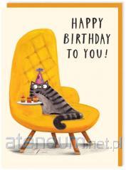 Karnet 309 Urodziny Kot z przekąskami na fotelu