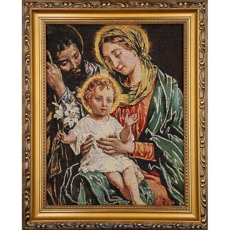Zanurz się w intymnej i pełnej miłości scenie Świętej Rodziny przedstawionej na tym wyjątkowym, haftowanym obrazie. Na ciemnym, głębokim tle Maryja czule trzyma na kolanach Dzieciątko Jezus,wpatrując się w Niego z matczyną miłością. Święty Józef z uwagą i troską spogląda na tę wzruszającą dwójkę. Mały Jezus trzyma w swojej prawej rączce delikatną gałązkę lilii, symbol czystości i niewinności. Piękne, stonowane kolory oraz subtelne złote nici podkreślają świętość i ciepło rodzinnego ogniska. Całość oprawiona jest w elegancką, zdobioną złotą ramę o szerokości około 3 cm, która doskonale akcentuje intymny charakter sceny. Obraz o wymiarach 22x27,5 cm będzie stanowił pełną harmonii ozdobę każdego wnętrza i inspirujący element kontemplacji.