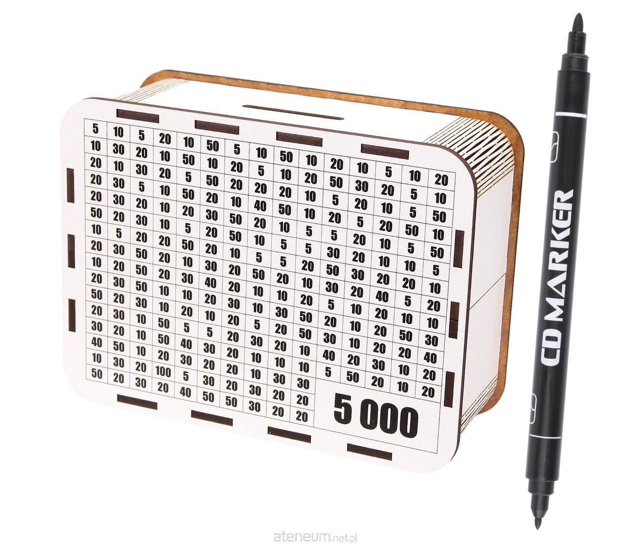 Duża (16cmx12cmx7cm) drewniana, ekologiczna skarbonka z grafiką celu 5.000zł razem z dołączonym czarnym markerem dwustronnym. Na powierzchni skarbonki znajduje się tabelka, w której można wykreślać kolejne wartości nominałów banknotów lub bilonu w miarę dodawania gotówki. Po wykreśleniu wszystkich pól skarbonka będzie zawierać 5000zł Posiada specjalny otwór na górze do wrzucania monet i banknotów. Skarbonka CRESCO to świetny prezent dla każdego na różne okazje. Skarbonka nie zawiera zawartości, ale po zakupie jest od razu gotowa na przyjecie gotówki :) Skarbonka sprzedawana jest już złożona w opakowaniu foliowym.