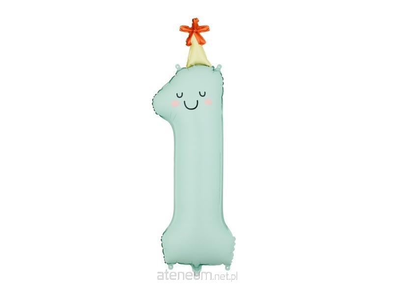 Balon foliowy matowy Cyfra \\'\\'1\\'\\' w kolorze miętowym z kolorową czapeczką. Rozmiar przed napompowaniem ok. 100 cm (39.4\\'\\'), rozmiar po napompowaniu ok. 86 cm (34\\'\\'). Do napompowania powietrzem i helem. Zestaw zawiera słomkę.