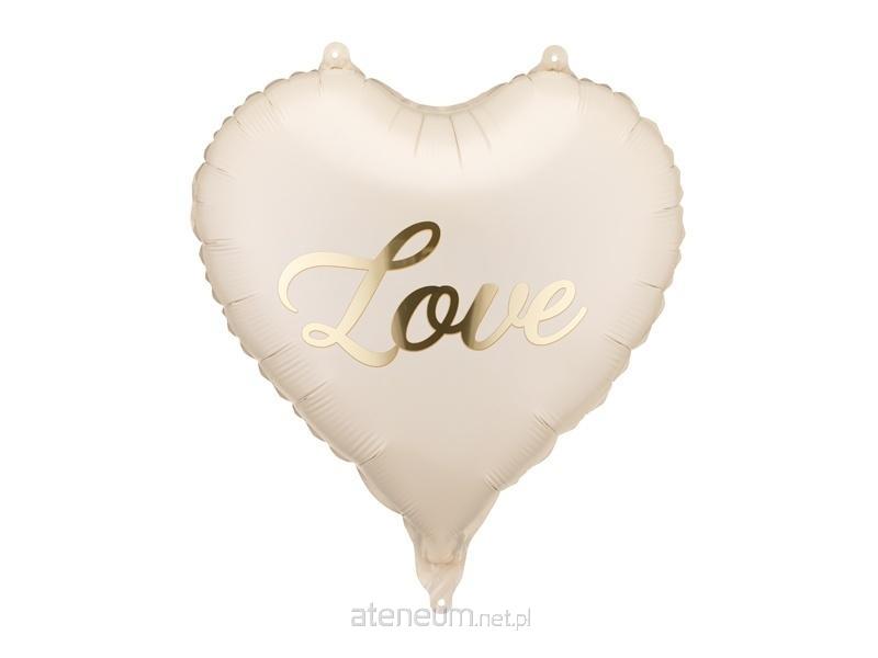 Balon foliowy serce z napisem Love, w kolorze beżowym ze złotym napisem. Wymiary przed napompowaniem ok. 45 cm (18\\'\\'), wymiary po napompowaniu ok. 35 cm (14\\'\\'). Do napompowania powietrzem i helem. Zestaw zawiera słomkę.