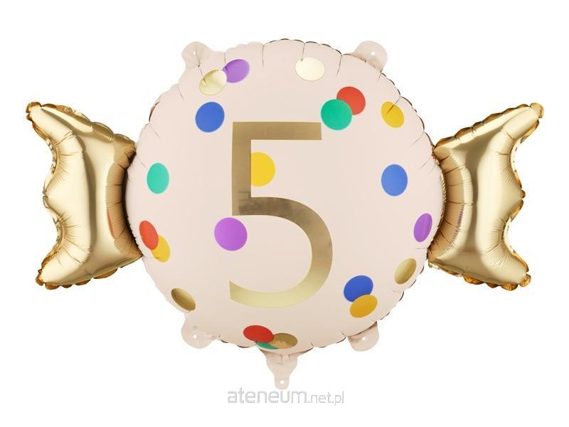 Balon foliowy Cukierek \\'\\'5\\'\\', w kolorze beżowo-złotym. Wymiary przed napompowaniem ok. 76,5 x 48 cm (30,1 x 18,9\\'\\'), wymiary po napompowaniu ok. 61 x 37 cm (24 x 14,6\\'\\'). Do napompowania powietrzem i helem. Zestaw zawiera słomkę.