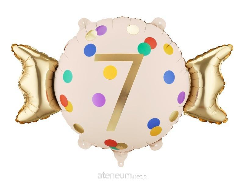 Balon foliowy Cukierek \\'\\'7\\'\\', w kolorze beżowo-złotym. Wymiary przed napompowaniem ok. 76,5 x 48 cm (30,1 x 18,9\\'\\'), wymiary po napompowaniu ok. 61 x 37 cm (24 x 14,6\\'\\'). Do napompowania powietrzem i helem. Zestaw zawiera słomkę.