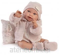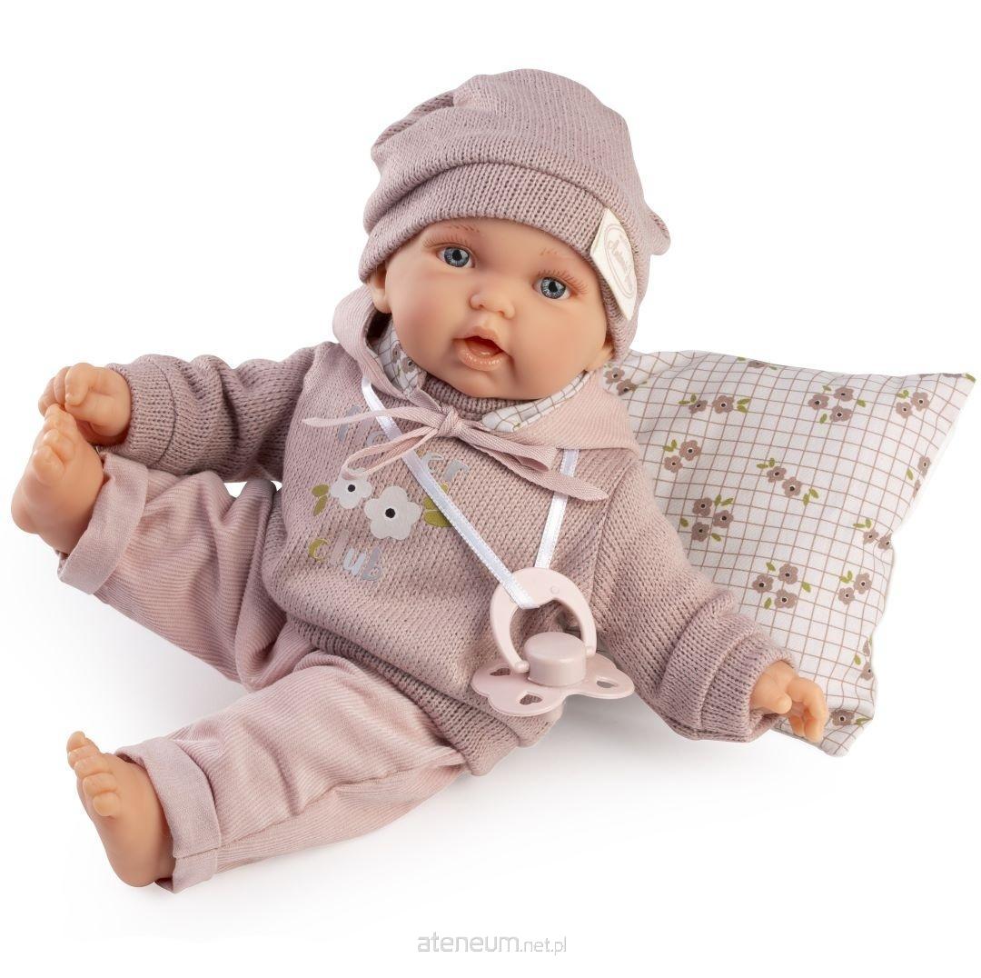Lalka hiszpańska Petit 12444 jest ubrana w ciepły sweterek z kapturem w kolorze pudrowego różu, ozdobiony kwiatuszkową aplikacją, oraz sztruksowe spodnie. Całość dopełnia czapeczka oraz smoczek zawieszony na satynowej tasiemce. W komplecie także poduszeczka w kratkę, który uatrakcyjnia zabawę w odgrywanie roli troskliwej mamusi. Wszystkie części garderoby można z łatwością zdjąć, a bobasa przebrać. Luksusu dodaje firmowe kartonowe, solidne, pięknie zaprojektowane pudełko.
