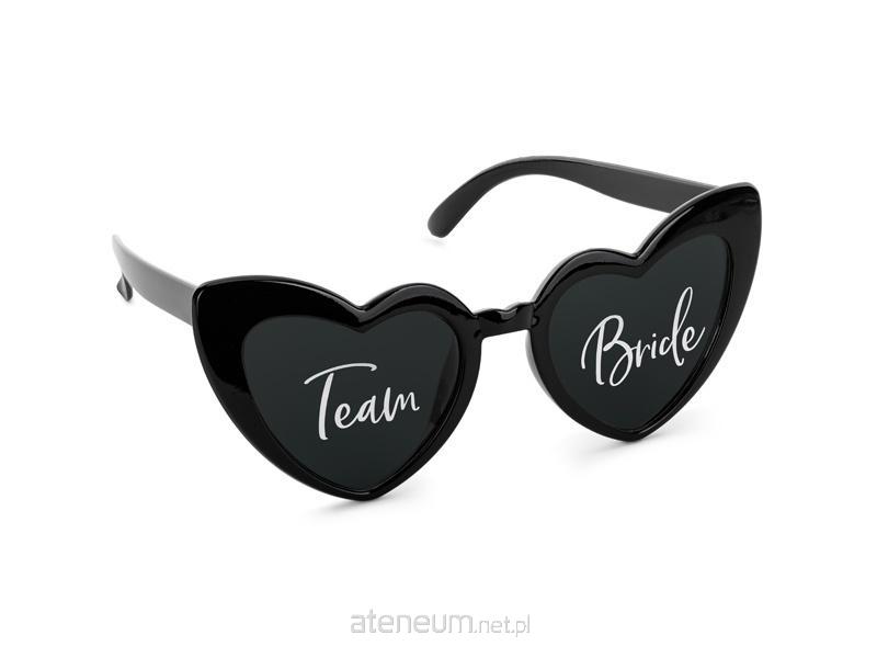 Okulary serduszka z napisem \\'\\'Team Bride\\'\\' w kolorze czarnym z czarnymi soczewkami. Wymiary: szerokość oprawki 14,8 cm, wysokość oprawki 6 cm, długość zausznika 13,5 cm.