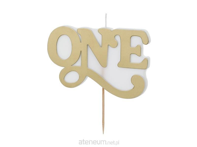 Świeczka urodzinowa \\'\\'ONE\\'\\' w kolorze zimnego złota. Wymiary produktu: szerokość 3.8 cm, wysokość 6.5 cm. Zamocowana na drewnianym patyczku o wysokości 3.3 cm.