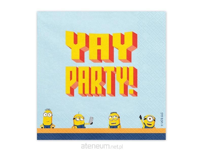 Serwetki papierowe 2-warstwowe Minionki z napisem Yay Party! w kolorze niebiesko-żółtym. Wymiary po rozłożeniu 33x33 cm, wymiary po złożeniu 16,5x16,5 cm(1 op. / 20 szt.)