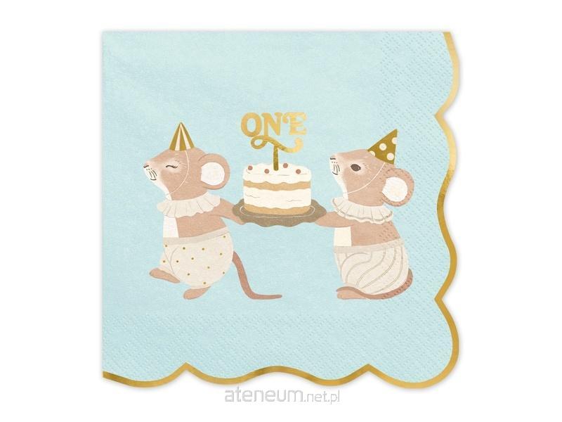 Serwetki papierowe 2-warstwowe Myszki z napisem One w kolorze niebieskim. Wymiary po rozłożeniu 33x33 cm, wymiary po złożeniu 16.5x16.5 cm.(1 op. / 12 szt.)