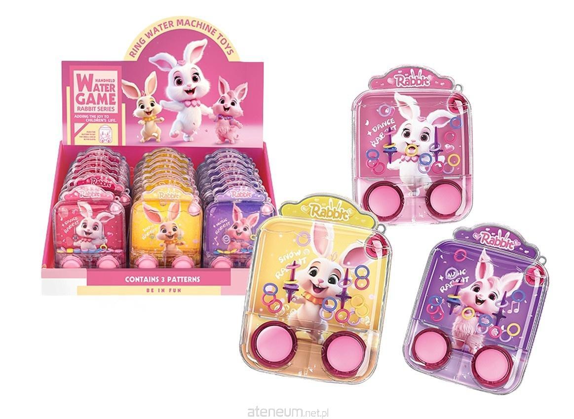3 wzory; wym. zabawki: 7,5 x 10 x 2 cm; funkcje: naciśnięcie przycisków steruje strumieniem wody, celem gry jest trafienie wszystkimi pierścieniami na słupki,