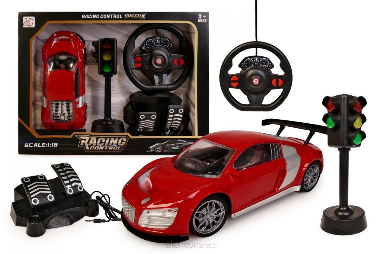 2 wzory; w zestawie: auto dł.: 26 cm, kierownica, pedały, sygnalizator świetlny wys. 22 cm; funkcje: 2 tryby sterowania samochodem - kierownica oraz kierownica+pedały, skręca się poprzez kręcenie kierownicą, pełny zakres jazdy, ustawienie zbieżności kół, efekty świetlne i dźwiękowe; częstotliwość: 27 MHZ; skala: 1:16; wym. opak.: 42 x 30,8 x 9 cm; baterie: 4 x AA 1,5 V (auto) niedołączone, 2 x AA 1,5 V (kierownica) niedołączone; 3 x AG13 (sygnalizator) dołączone; 3+