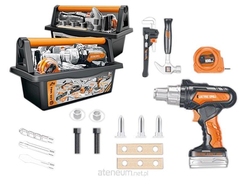 W zestawie: skrzynka na narzędzia wym. 28,5 x 16 x 13 cm, wiertarko-wkrętarka, deseczki, klucz, młotek, miarka, nakrętki, śruby, śrubokręt, funkcje: wiertarko-wkrętarka - po naciśnięciu przycisku, wiertło się obraca, wym. opak. 28,5 x 16 x 13 cm, baterie: 3 x AA 1,5V niedołączone, 3+