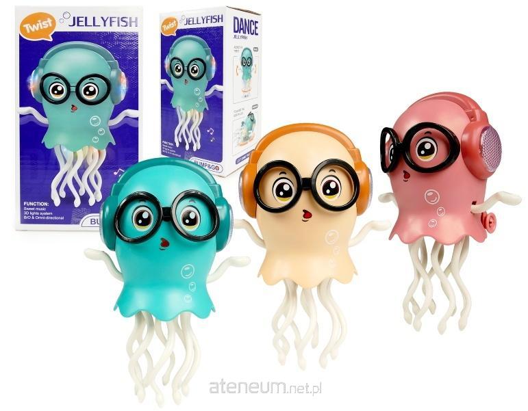 3 wzory; w zestawie: meduza wym. 14 x 20,2 x 11 cm, uchwyt do wędki, plastikowa wędka z haczykiem na sznurku; funkcje: meduza reaguje na dźwięki i dotyk - porusza się w sposób dający efekt \"tańca\", w trakcie ruchu odtwarza wesołe melodie; wbudowane podświetlenie, funkcja bump&go; wym. opak.: 11,2 x 20,6 x 10,2 cm; baterie: 3 x AA 1,5 V niedołączone; 3+