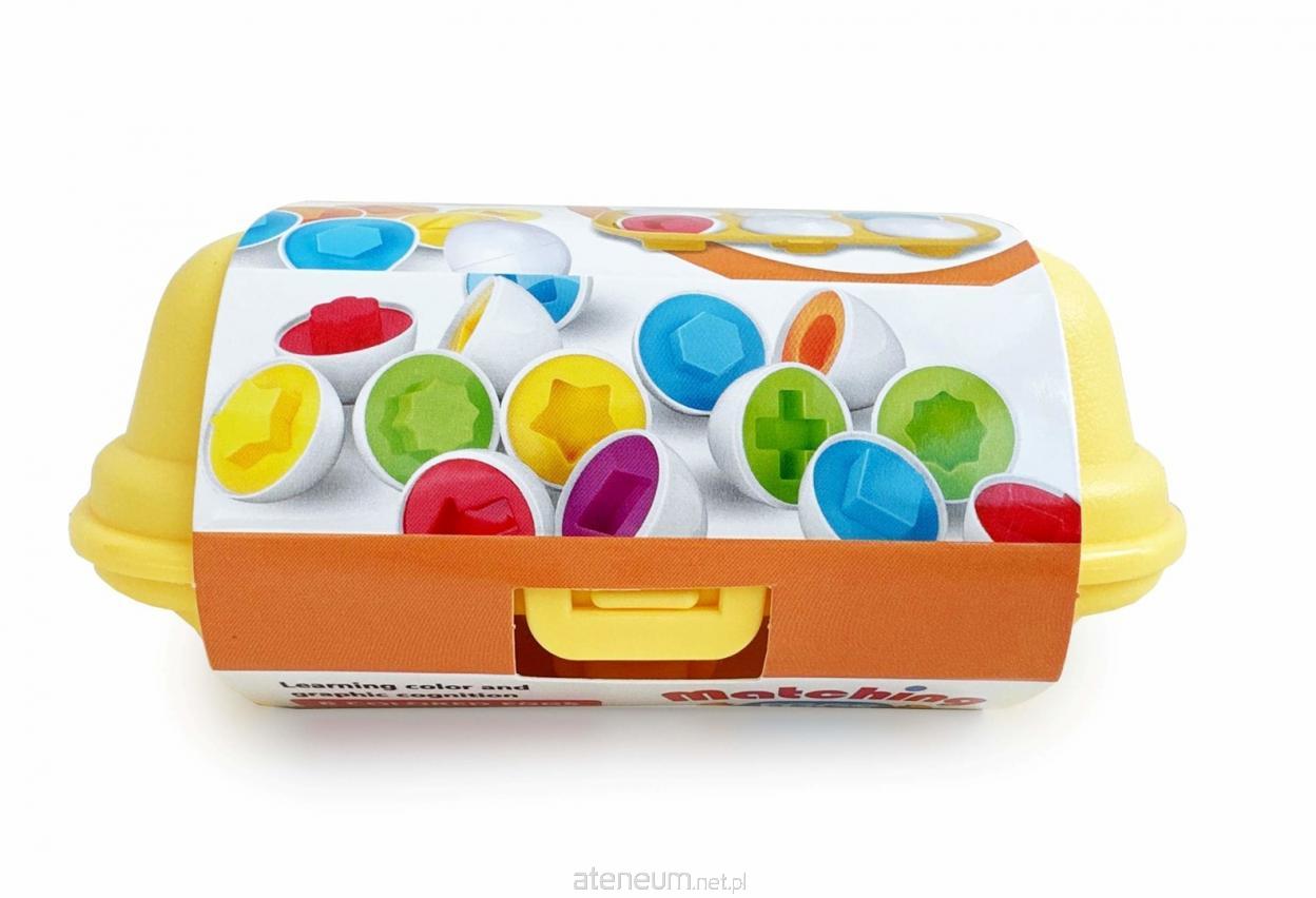 w zestawie: 6 jajek wys. 6 cm, wytłaczanka, funkcje: jajka podzielone są na 2 części, każde jajko posiada inny kształt. Zabawa polega na dopasowaniu kształtów tak, by jajko się zamknęło, wym. Opak. 16 x 12 x 7 cm