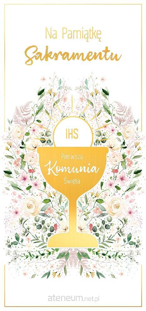 Pudełko Pamiątkowe z okazji Komunii Świętej o wymiarach 245x135x20mm. Zawiera karnet okolicznościowy DL z życzeniami, całość stanowi komplet graficzny z pudełkiem. Produkt wysokiej jakości uszlachetniony złotem.