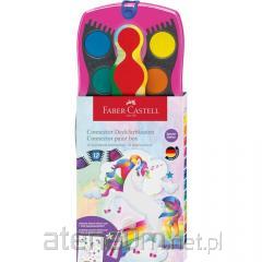 Łatwo zmywalne farby akwarelowe o bardzo dużej wydajności. Sprawdzają się podczas nauki malowania. Mogą być idealnym prezentem dla małego artysty. Dzięki wysokiej odporności na światło, kolory nie wyblakną a prace plastyczne zachowają swoje intensywne barwy przez długi czas.\nSkładają się z wysokiej jakości drobno roztartych pigmentów, połączonych rozpuszczalnym w wodzie spoiwem. Oprócz pigmentów i spoiw akwarele szkolne zawierają pewne ilości wypełniaczy, które sprawiają, że farba wysychając matowieje.\nDzięki temu nakładając farbę grubiej można malować technikami zbliżonymi do gwaszu, a w większych rozcieńczeniach technikami charakterystycznymi dla akwareli. Akwarele można wykorzystywać w technikach łączenia z farbami temperowymi, plakatowymi i kredkami woskowymi.\nAkwarele przeznaczone są głównie dla dzieci i młodzieży szkolnej rozpoczynającej edukację plastyczną. Dzięki swej postaci mogą być łatwo przenoszone np. w uczniowskich tornistrach oraz przechowywane przez długi czas bez obawy zmiany właściwości. Farby akwarelowe są tzw. farbami suchymi, nie wylewają się i łatwo je zmyć, dlatego są idealny dla najmłodszych artystów.\nZestaw wysokiej jakości farb akwarelowych w 12 kolorach Całość zamknięta jest w plastikowym pudełku, który wraz z pędzlem tworzy gotowy zestaw do malowania i ułatwia przechowywanie.