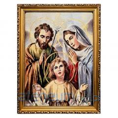 Piękne, bogate kolory oraz dostojne złote nici nadają wizerunkowi wyjątkowego blasku i podniosłości. Haftowana technika tworzy unikalną fakturę i głębię, sprawiając, że obraz jest nie tylko przedmiotem kultu, ale także artystycznym dziełem. Całość oprawiona jest w elegancką, zdobioną złotą ramę o szerokości około 3 cm, która doskonale podkreśla sakralny charakter dzieła.