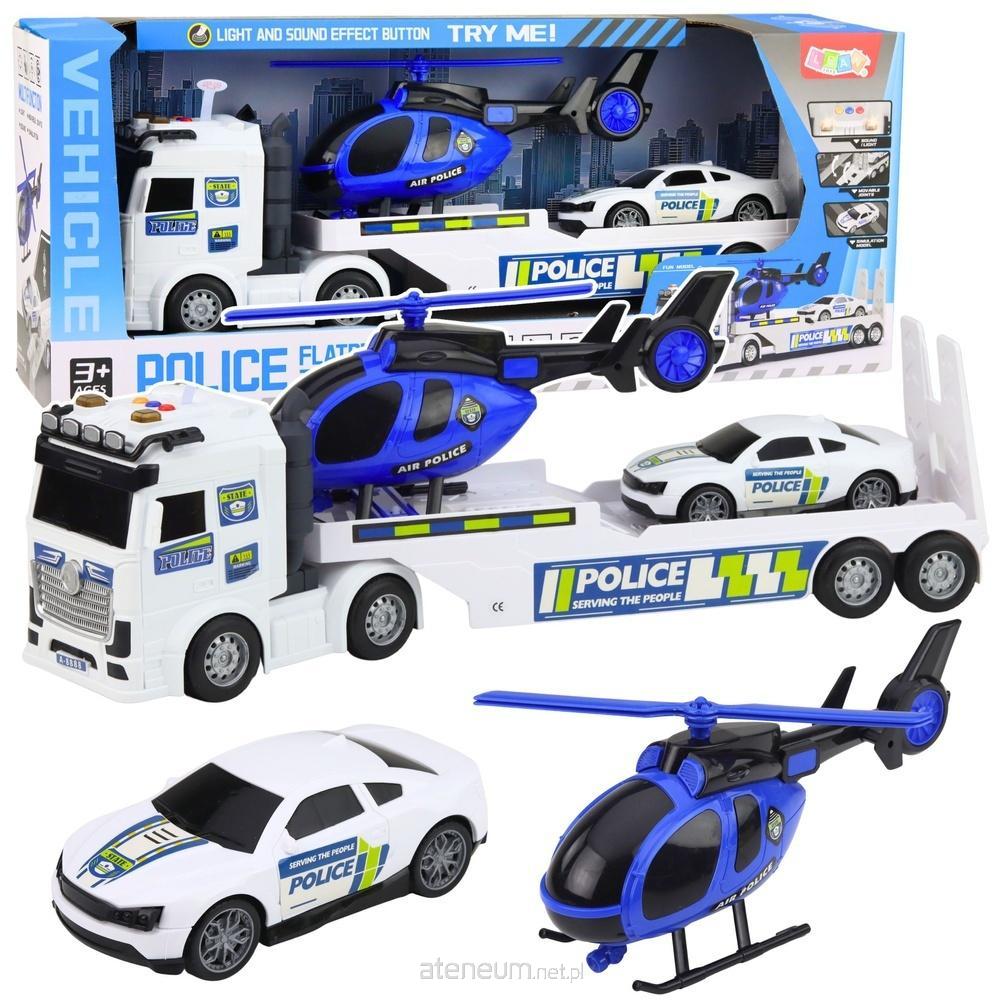 Centralnym elementem zestawu jest duża ciężarówka z lawetą przystosowaną do transportu pojazdów policyjnych. Na naczepie znajduje się miejsce na helikopter oraz samochód policyjny, dzięki czemu dziecko może odgrywać różnorodne scenariusze akcji policyjnych, transportu pojazdów oraz misji patrolowych. Ciężarówka została wyposażona w efekty świetlne oraz dźwiękowe, które zwiększają realizm zabawy i sprawiają, że każda akcja policyjna staje się jeszcze bardziej emocjonująca.