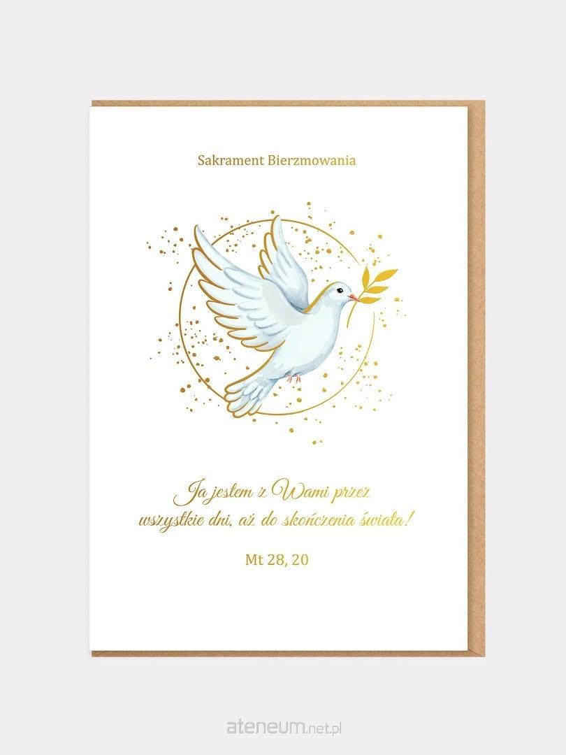 Gołąb z gałązką oliwną symbolizuje Ducha Świętego, pokój i umocnienie - dokładnie to, co niesie ze sobą sakrament bierzmowania. Złote akcenty i subtelna, artystyczna ilustracja nadają kartce bardziej dojrzały charakter niż klasyczne kartki religijne, dzięki czemu będzie odpowiednia dla młodzieży przystępującej do bierzmowania.