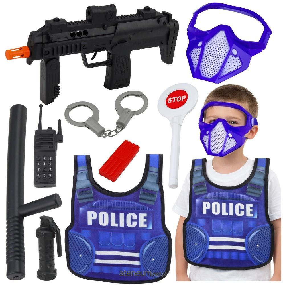 Akcesoria: pistolet, kajdanki, krótkofalówka, pałka policyjna, znak STOP, okulary