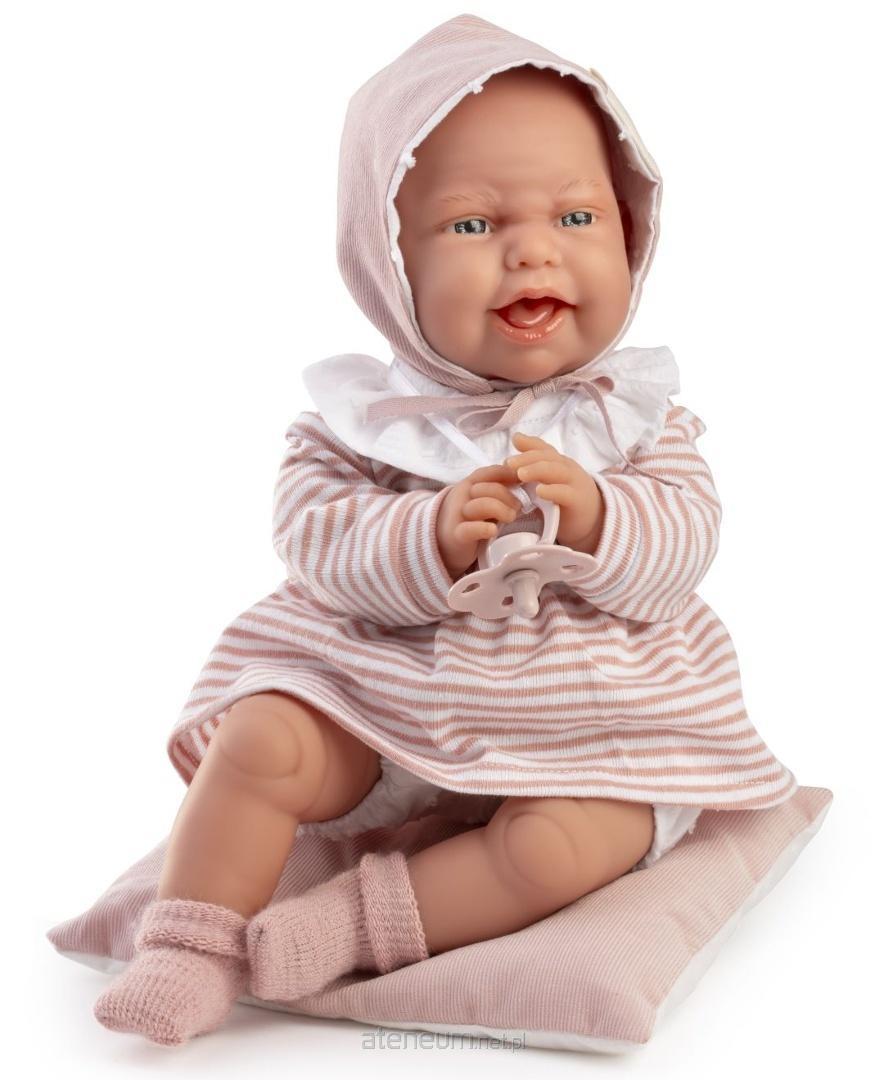 Realistycznie wyglądająca, winylowa dziewczynka z miękkim brzuszkiem posiada wyrzeźbione włoski oraz delikatnie malowane brwi, usta, paznokcie i fałdki. Clara od marki Antonio Juan ubrana jest w mięciutką, bawełnianą sukienkę w paseczki. Ręcznie szyty w Hiszpanii strój uzupełnia wiązana czapeczka, białe majteczki oraz skarpetki.