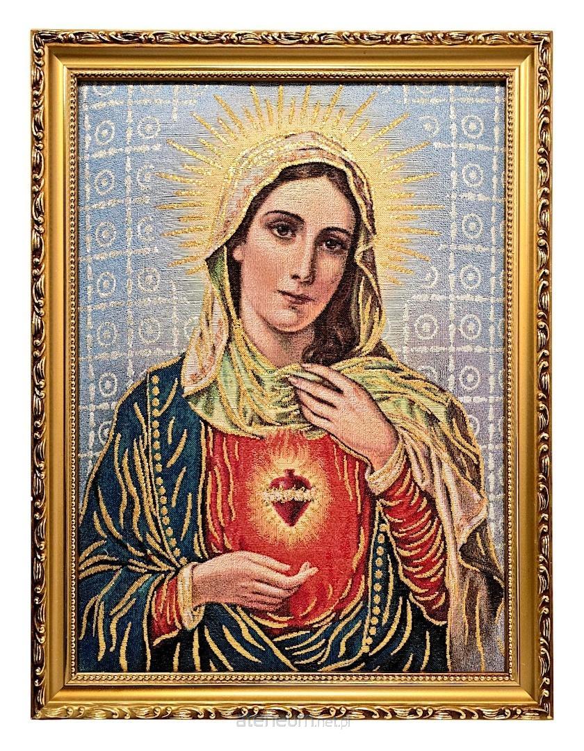 Obraz został wykonany z najwyższą dbałością o szczegóły, aby jak najwierniej oddać łagodność i majestat Matki Bożej. Zastosowanie wysokiej jakości nici hafciarskich gwarantuje trwałość kolorów i piękny połysk przez długie lata. Złota rama nie tylko chroni dzieło, ale nadaje mu prestiżowego wyglądu, sprawiając, że obraz staje się cenną rodzinną pamiątką. To idealna propozycja dla osób pragnących otaczać się pięknem sakralnym i pogłębiać swoje nabożeństwo do Niepokalanego Serca Maryi.