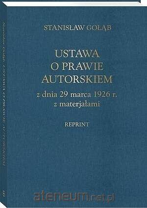 Publikacja jest reprintem dzieła Stanisława Gołąba pt. "Ustawa o prawie autorskiem z dnia 29 marca 1926 z materjałami" wydanego w 1926 r. nakładem Wydawnictwa im. Kasy Mianowskiego. Dzięki lekturze książki współcześni czytelnicy mogą poznać przebieg prac nad tym aktem prawnym. Opracowanie wyróżnia się edytorsko na tle innych, współcześnie wydawanych książek. Oddano ducha tamtych lat poprzez zastosowanie płóciennej, szlachetnej oprawy oraz nawiązano do dawnej szaty graficznej i liternictwa.