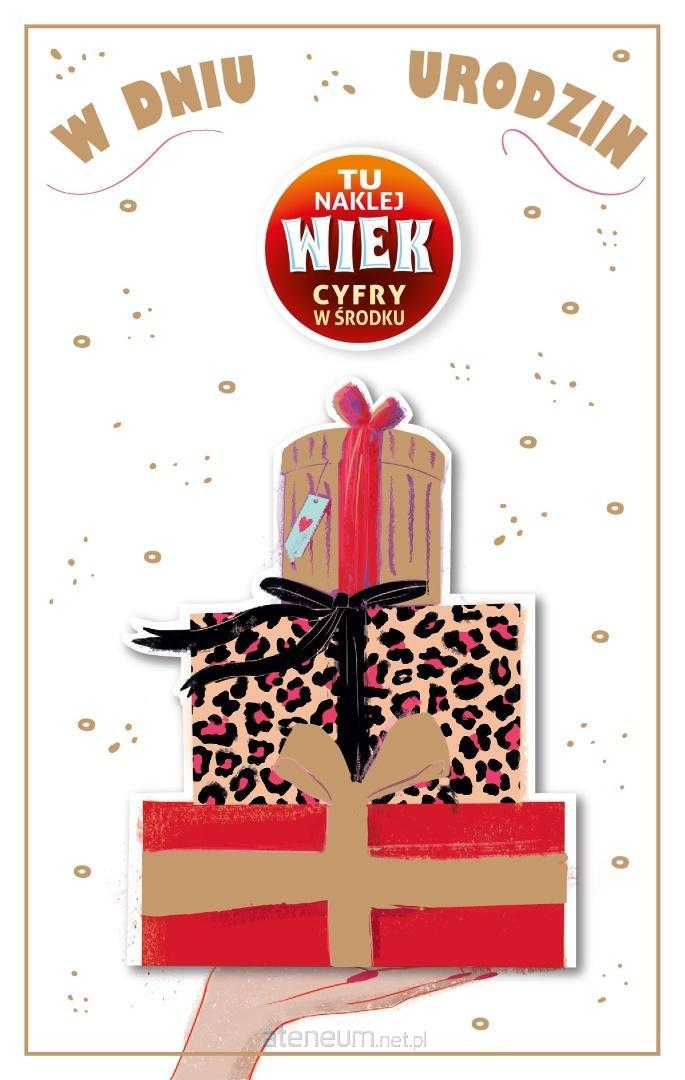 Karnet urodzinowy z życzeniami w środku, złocenie, naklejane elementy oraz naklejki z cyframi do personalizacji wieku