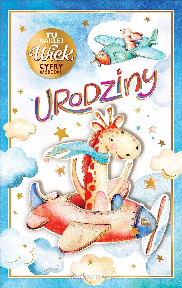 Karnet urodzinowy z życzeniami w środku, złocenie, naklejane elementy oraz naklejki z cyframi do personalizacji wieku