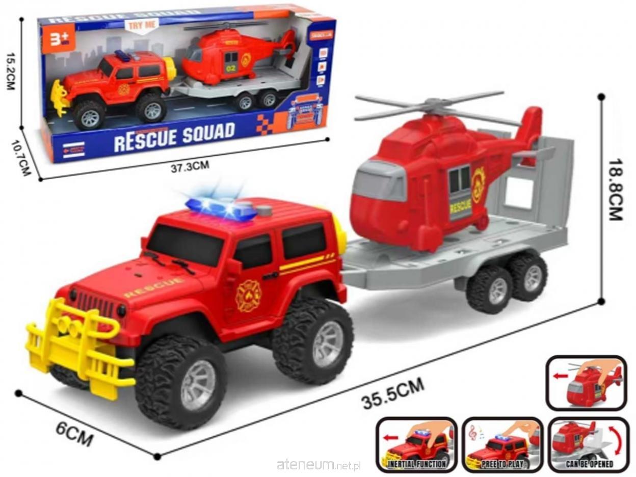 Dynamiczny zestaw ratunkowy Rescue Squad to idealna propozycja dla małych fanów służb ratunkowych. W komplecie znajduje się terenowy samochód z przyczepą oraz helikopter ratunkowy. Auto wyposażone jest w efekty świetlne i dźwiękowe oraz napęd typu "inertia" (wystarczy popchnąć, aby pojazd sam pojechał do przodu). Helikopter można zdejmować z przyczepy, a wybrane elementy są otwierane, co uatrakcyjnia zabawę i pozwala odgrywać realistyczne akcje ratunkowe. Cechy produktu: Napęd typu friction (inertia); Efekty świetlne i dźwiękowe; Zdejmowany helikopter; Otwierane elementy; Duże, terenowe koła; Solidne wykonanie. Wymiary zestawu (auto z przyczepą): Długość: 35,5 cm; Szerokość: 6 cm; Wysokość: 18,8 cm. Wymiary opakowania: 37,3 15,2 10,7 cm. Produkt przeznaczony dla dzieci powyżej 3. roku życia.