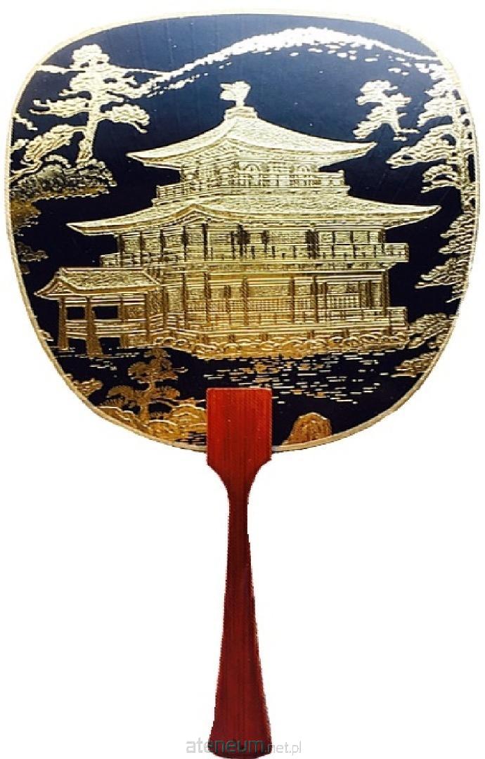 Elegancki japoński karnet premium z piękną, artystyczną ilustracją. Przedstawia tradycyjny japoński wachlarz (uchiwa) w głębokim, eleganckim czarnym kolorze ze złotymi akcentami. Na powierzchni wachlarza znajduje się klasyczna scena przedstawiająca pagodę otaczoną sosnami i gałęziami drzew na tle złotego nieba. Ilustracja utrzymana jest w tradycyjnym stylu ukiyo-e, z wyraźnym kontrastem czerni i złota, co nadaje jej szlachetny i wyrafinowany charakter. Karnet w zestawie z kopertą, bez tekstu w środku.