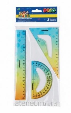 zawiera: linijkę 30cm, 2 ekierki: 13cm/19,5cm, kątomierz