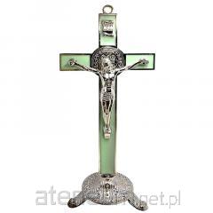 Krzyż ma około 23,5 cm wysokości (z podstawką) i 10,5 cm szerokości, co czyni go dostojnym akcentem w każdym pomieszczeniu. Wykonany z trwałego metalu,wyróżnia się srebrnym kolorem i unikalnym, czarnym wypełnieniem, które nadaje mu wyjątkowego charakteru. To intrygujące połączenie kolorów podkreśla jego formę i symbolikę.