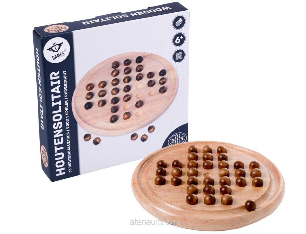 Pasjans z drewna kauczukowego z 33 drewnianymi kulkami. Przedmiot jest dostarczany w kolorowym pudełku. Średnica: 23 cm.
