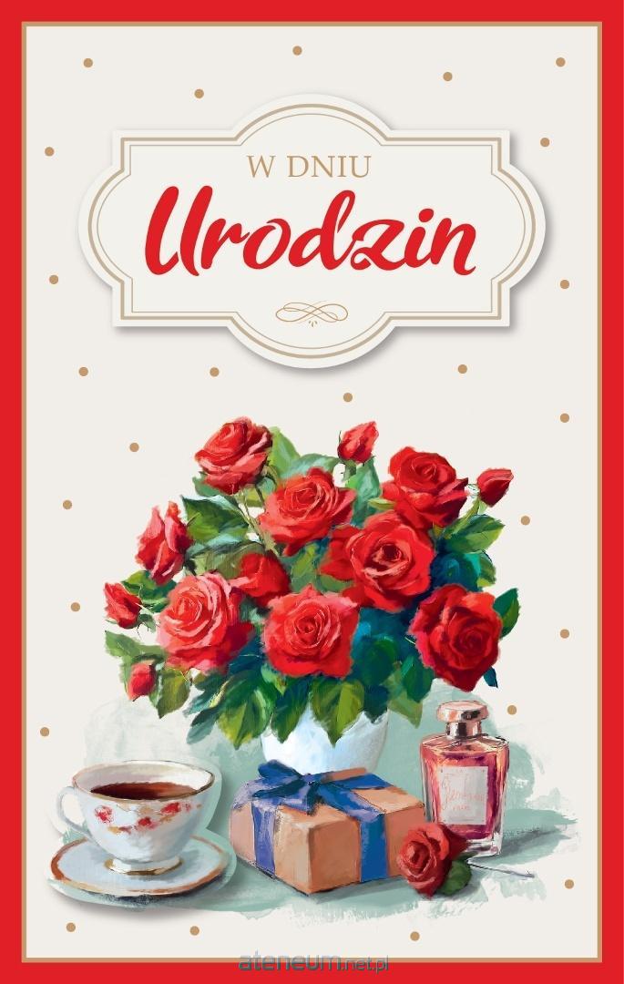 Karnet urodzinowy z kopertą, naklejane elementy, złocony, tekst życzeń w środku.