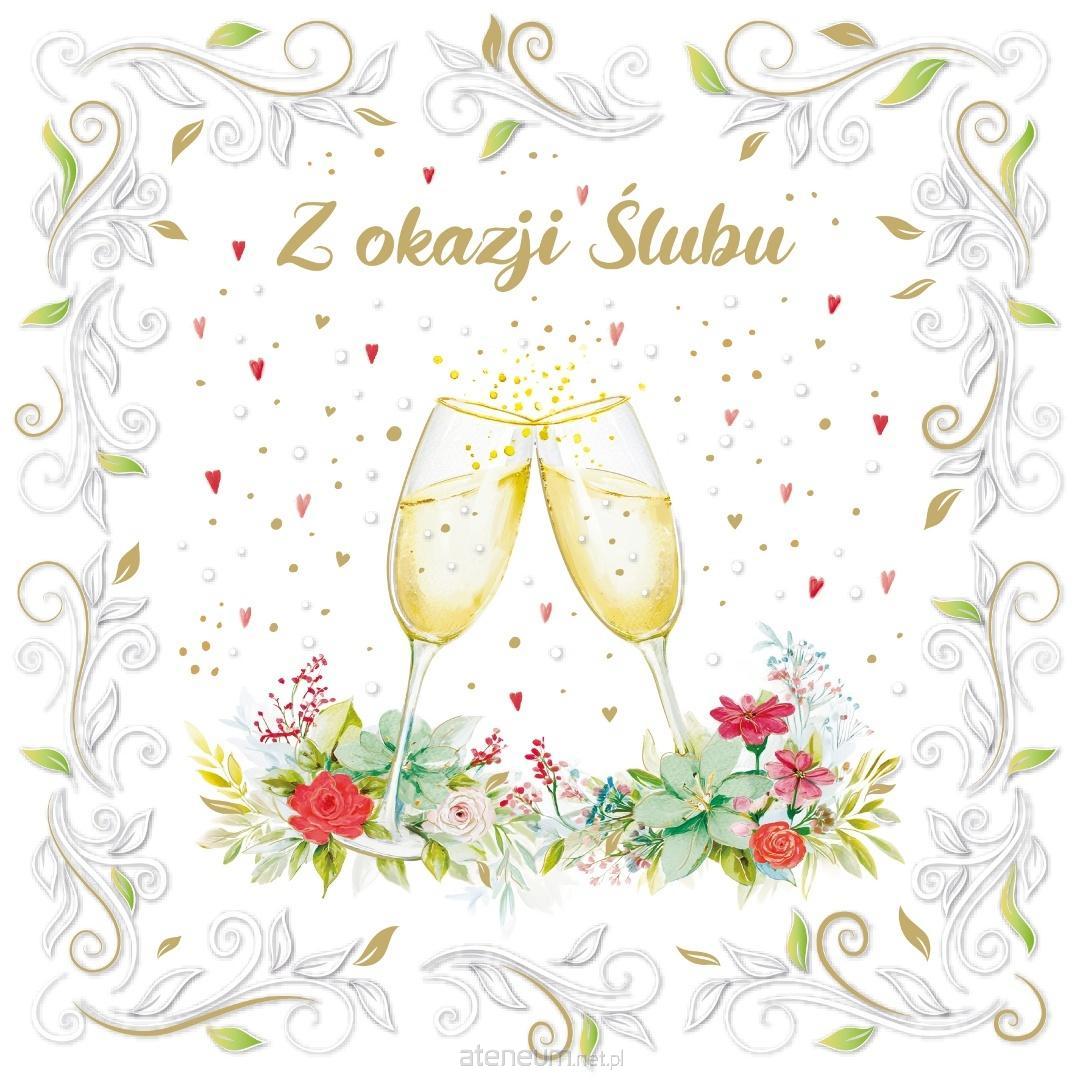 Karnet ślubny z kopertą, złocony i tłoczony, tekst życzeń w środku.