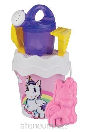 W zestawie: wiaderko, pokrywka pełniąca jednocześnie rolę sitka, żółte grabki i łopatka, foremka w kształcie jednorożca, fioletowa konewka zdobiona brokatem