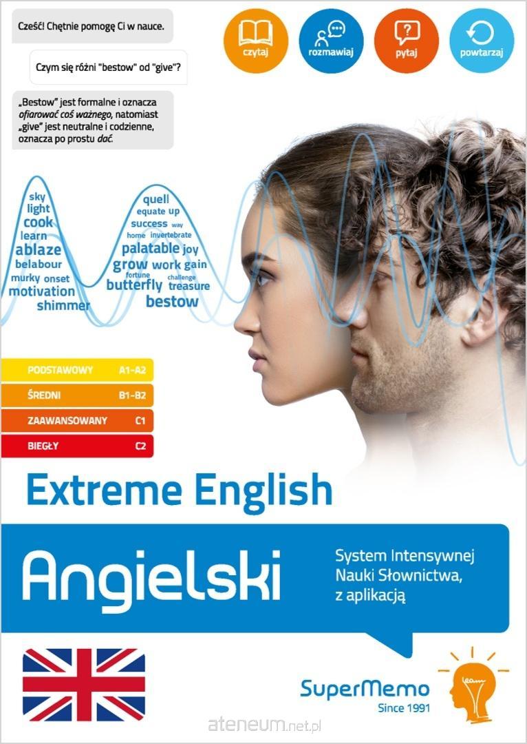 Poznaj ponad 27 tysięcy słów angielskich na poziomie podstawowym i średnim (A1-B2) oraz zaawansowanym i biegłym (C1-C2) oraz zapamiętaj je na zawsze dzięki metodzie inteligentnych powtórek SuperMemo. Extreme English zapewni Ci najlepsze wsparcie dla intensywnej i skutecznej nauki: kiedy przygotowujesz się do egzaminów, takich jak matura, B2 First (FCE), CAE, CPE lub TOEFL, lub dążysz do biegłości językowej. Objętość materiału odpowiada zasobowi słownictwa wykształconego native speakera języka angielskiego. Rozbudowane słownictwo umożliwia nie tylko płynną komunikację, ale także wyrażanie myśli w sposób zarówno precyzyjny, jak i zwięzły. Publikacja obejmuje również dodatki cyfrowe (PDF, MP3) oraz naukę wspieraną metodą inteligentnych powtórek SuperMemo online i w aplikacjach.