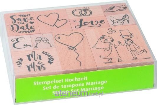 Zestaw 11 drewnianych stempli, każdy z innym motywem.